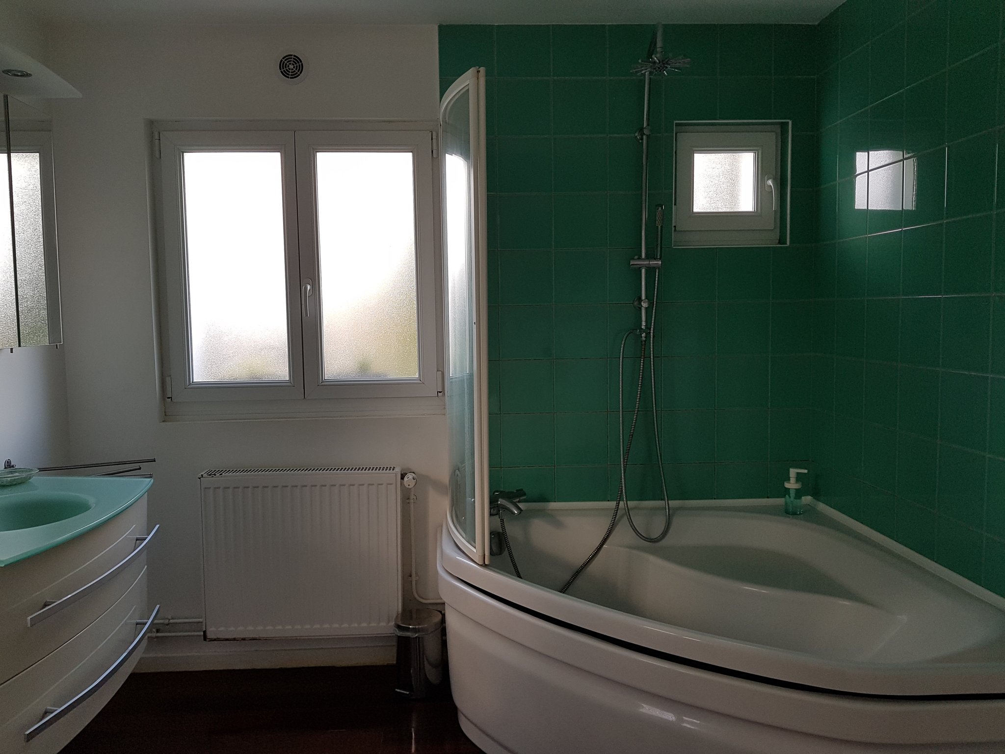 Salle de bain de 10m² avec baignoire & pare-douche, lavabo, lave-linge & sèche-linge, serviettes de toilettes, sèche-cheveux, produits