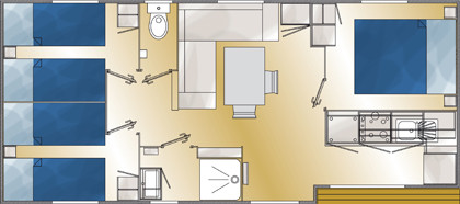 Hébergement spacieux de 31m² avec 3 chambres, terrasse. Location en 2 nuits minimum, ménage fin de séjour en option, situé emplacement 1.